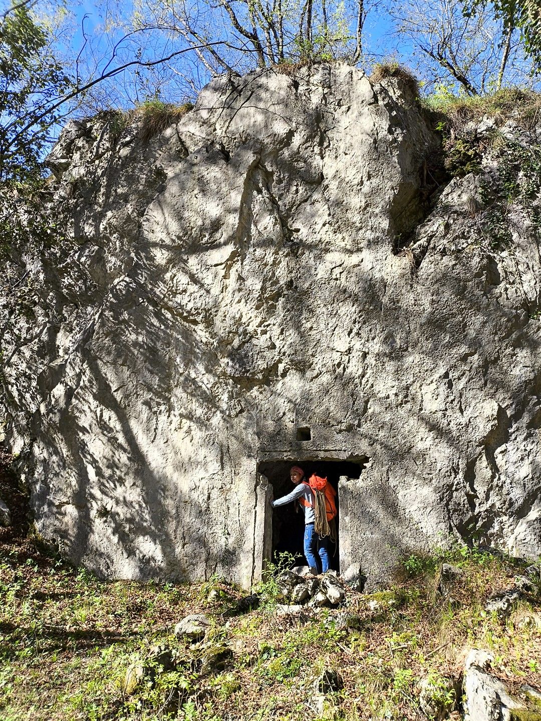Qui sulla sinistra si vede il sentiero da cui si scenderà al ritorno. Si prosegue invece dritti incontrando subito una grotta alla propria destra.