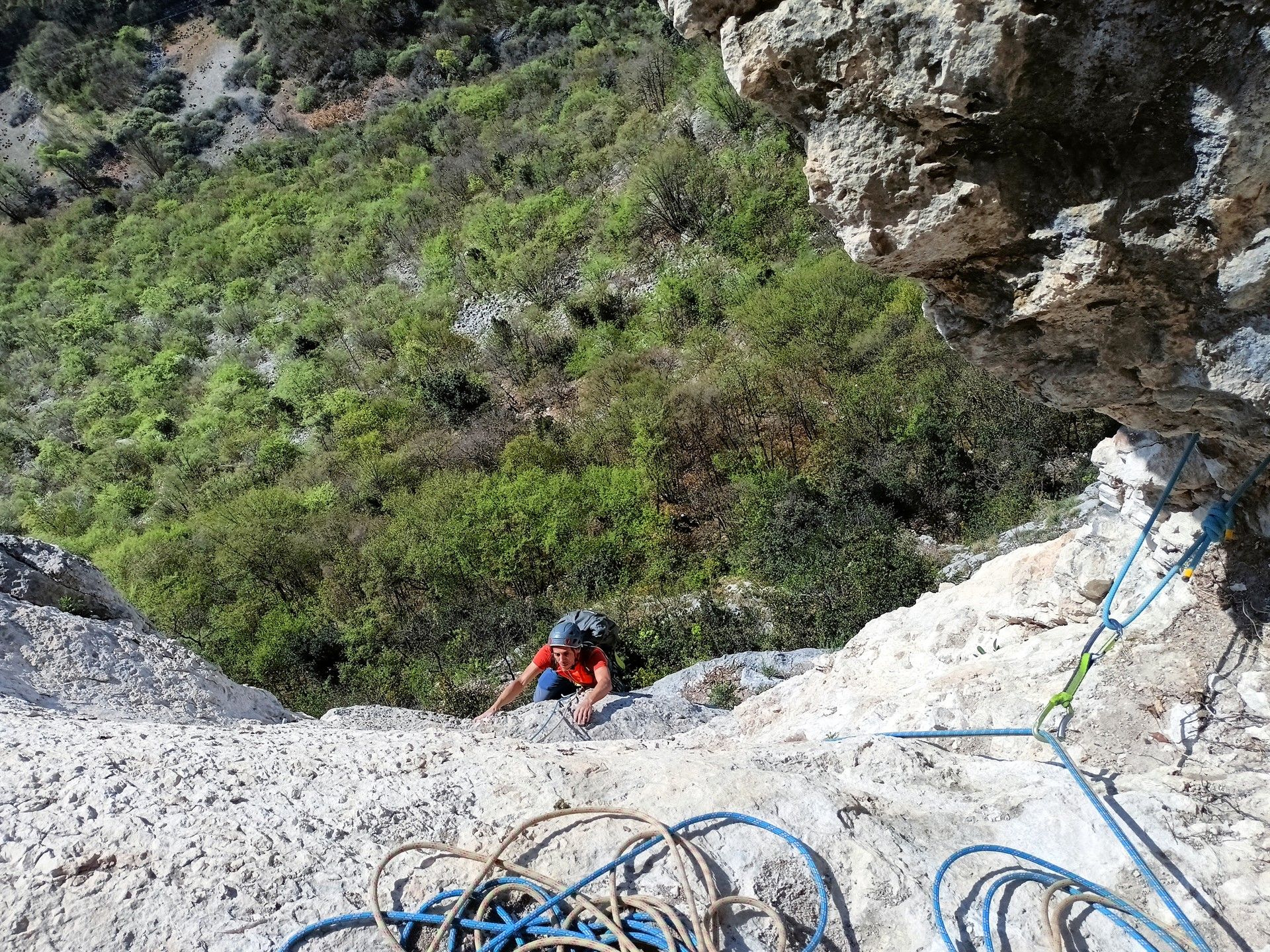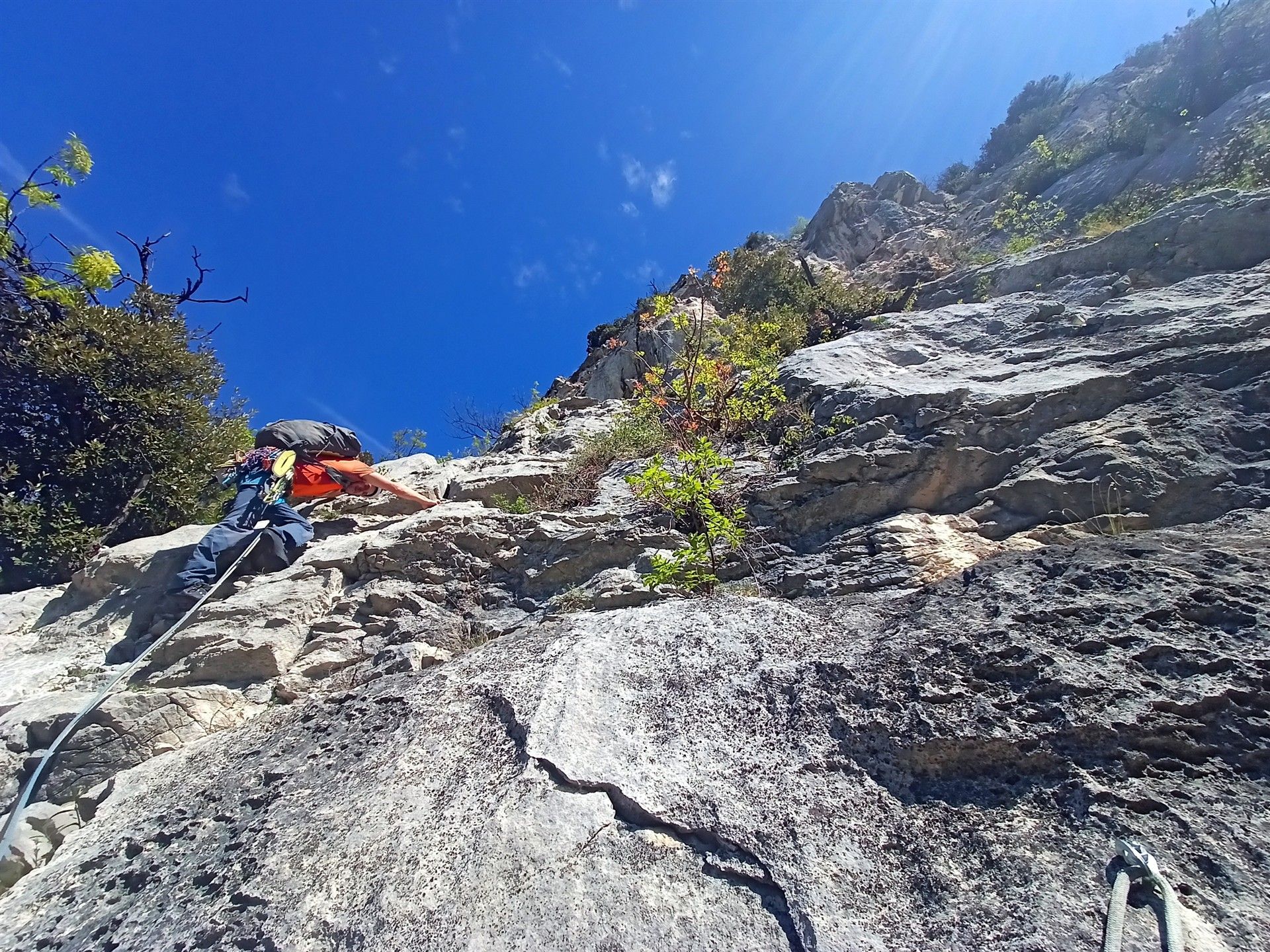 6. L6 – II+ (15m) – Traversare ancora a destra su cengia esposta fino a raggiungere la sosta sotto uno strapiombino.