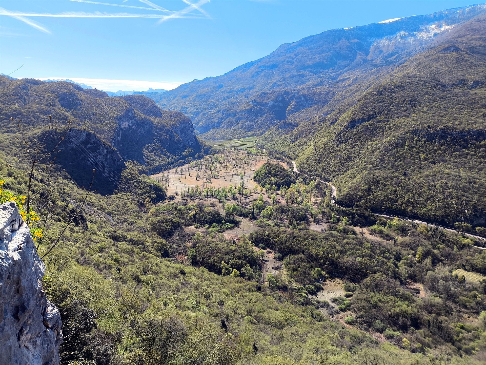 Bellissima la vista: si scorge un angolino suggestivo del Lago di Garda circondato dai monti e dalla parte opposta il Lago di Loppio. Voi direte ma dov’è sto Lago di Loppio?! Più che un lago in effetti oggi è un bacino lacustre, una piana dove svettano parecchi alberi e di acqua visibile spesso non c’è traccia, se non in periodi particolari dell’anno caratterizzati da forti piogge. Tutto causato da un disastro ambientale che risale alla costruzione della Galleria Adige-Garda nella prima metà degli anni ’90… Un lago effimero dunque: quando l’acqua c’è è uno spettacolo veramente particolare, con salici e pioppi a impreziosirne la superficie.