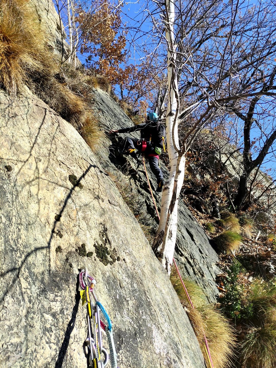 Poi per rocce più generose fino alla base di una spalla che si supera con qualche passo in dulfer fino alla sosta su terrazzino. - 5c, 1 passo di 6a (30m) – Spostarsi a destra aggirando una betulla fino alla base di una facile placca nera che si rimonta fino alla parete successiva.