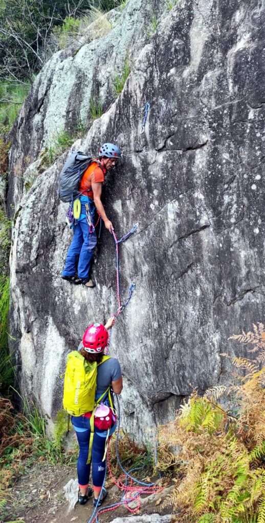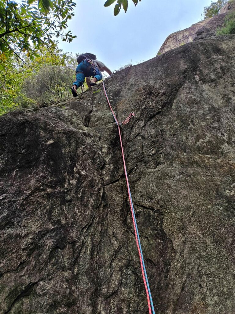 - 5c+/6a, poi 5a (20m) – Salire la bella placca verticale a destra della sosta con passi di aderenza e movimento fino al suo termine, poi per rocce più semplici fino in sosta al termine del risalto. Volendo il tiro a sinistra della sosta sembra più facile, ad occhio 5a, ma non l’abbiamo fatto quindi non garantiamo 😉