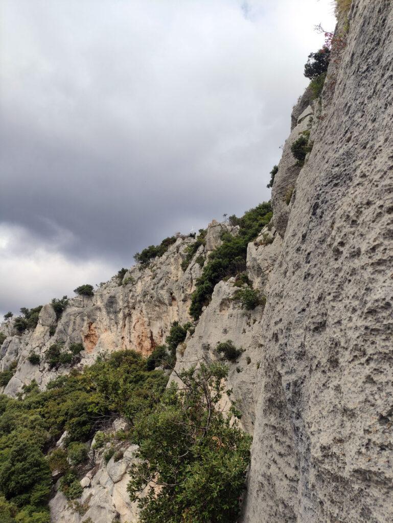 - III (20mt) – Salire le roccette sopra alla sosta, poi camminare verso destra tra arbusti fino alla base di una placca dove si sosta, in corrispondenza di un terrazzo.