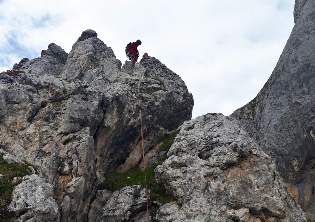 Da lì potete cercare la prima calata che dovrebbe essere sulla parete opposta rispetto alla cima e che scende nel canalino erboso accanto allo spigolo. Non sappiamo ogni quanti metri troverete le calate quindi nel dubbio usate entrambe le mezze nel caso.