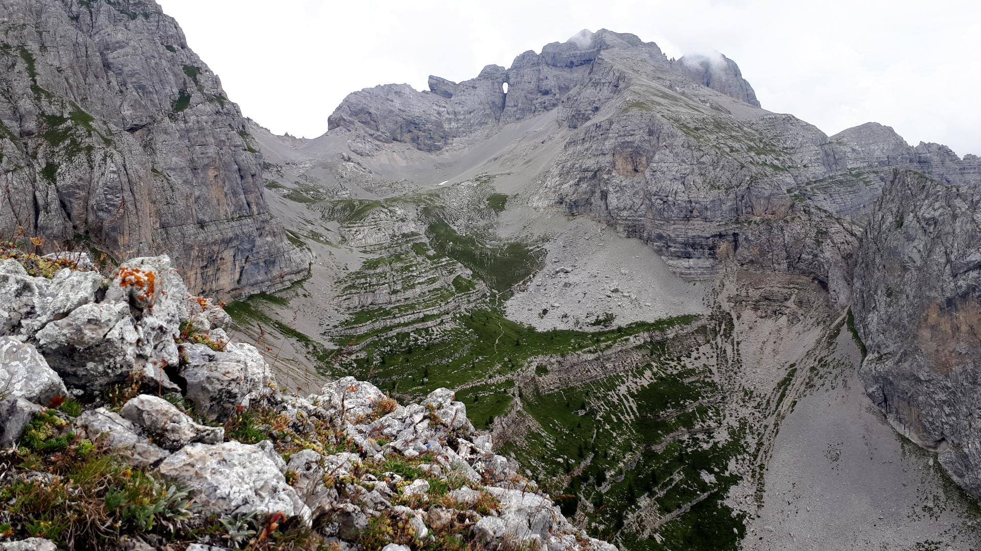6) IV (30mt) – A sinistra dello spigolo fino sotto uno strapiombo. Seguire poi una rampa erbosa che sale in diagonale sinistra fino alla base di una parete verticale (ch) che va rimontata direttamente con passi divertenti fino ad un terrazzo sullo spigolo sotto uno strapiombo.