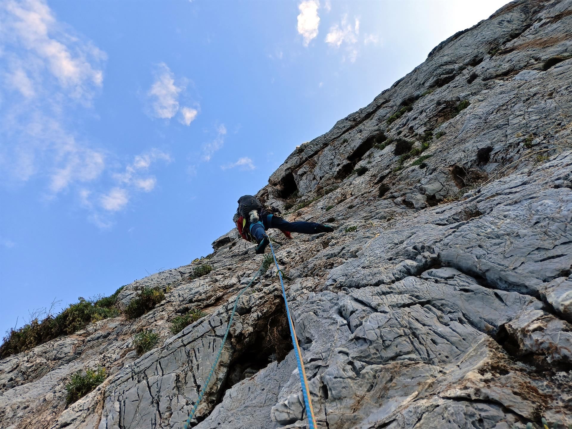 Ciò nonostante, dato che la via era di soli tre tiri, su gradi per noi super fattibili, abbiamo escogitato un piccolo espediente per non rischiare di rimanere bloccati sulla scogliera e ci abbiamo provato.